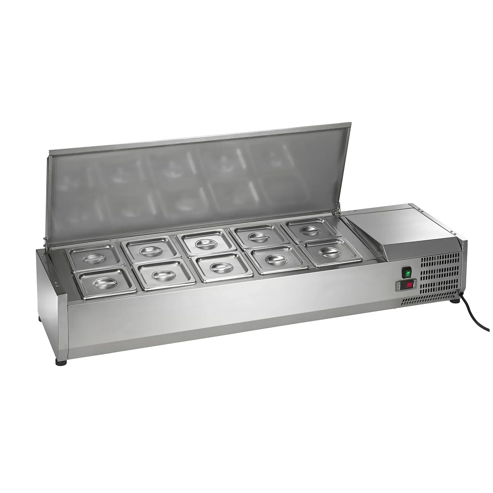 Preserve, serve with perfection. Introducing the Arctic Air ACP55 Refrigerated Countertop Pan Rail, the ideal solution for commercial restaurant use. This refrigerated prep unit is designed to keep your ingredients fresh and easily accessible, ensuring efficient food preparation and service. With a spacious 55" width, it includes ten 1/6 stainless pans and covers, allowing you to organize and store a variety of ingredients. The self-contained capillary tube refrigeration system maintains a temperature range of 33F to 41F, keeping your ingredients at the perfect temperature for optimal freshness. The electronic thermostat with an external digital LED display allows for precise temperature control. Made with durable stainless steel construction and equipped with plastic feet, this unit is built to withstand the demands of a busy kitchen. The ACP55 uses R290 Hydrocarbon refrigerant, making it environmentally friendly. Trust Arctic Air to deliver reliable and efficient refrigeration solutions for your commercial restaurant needs.