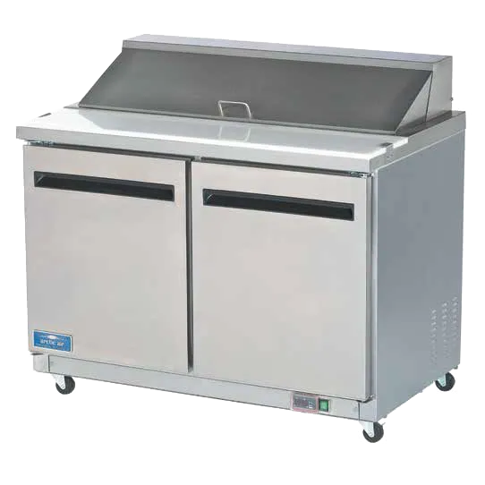 Elevate freshness to perfection with the Arctic Air AMT48R Refrigerated Counter, Mega Top Sandwich / Salad Unit. Designed for commercial restaurant use, this two-section prep table offers a spacious 48-1/4" width and a generous 12.0 cu. ft. capacity. The rear-mounted self-contained refrigeration system ensures optimal cooling, while the electronic thermostat with digital LED temperature display allows for precise temperature control. With a 9"D cutting board and (18) 1/6 pans included, you'll have plenty of space to prepare and store your ingredients. The unit features two solid hinged self-closing doors and two wire shelves for easy access and organization. The stainless steel front and sides provide durability, while the white ABS interior liner with a stainless steel floor ensures easy cleaning. Equipped with four 3" casters, including two locking, this unit is easy to move and secure in place. Trust Arctic Air to deliver exceptional quality and functionality for your commercial kitchen needs.