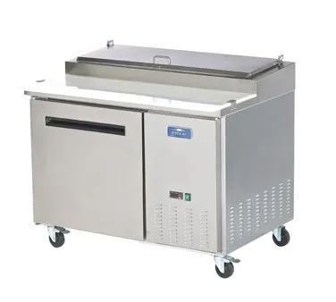 Elevate freshness with top storage. Introducing the Arctic Air APP48R Refrigerated Counter, Pizza Prep Table. Designed for commercial restaurant use, this one-section pizza prep table offers a spacious 47.5"W stainless steel top with a refrigerated pan rail, perfect for keeping your ingredients cool and easily accessible. With a 12 cu. ft. capacity and a temperature range of 33F to 41F, this table ensures optimal freshness for your pizza toppings. The electronic thermostat with a digital LED temperature display allows for precise temperature control. The table also features a 17.75" cutting board and comes with six 1/3 size pans. The solid hinged self-closing door and stainless steel construction ensure durability and easy cleaning. Equipped with four 6" casters, including two locking, this table is easy to move and secure in place. Elevate your restaurant's efficiency and freshness with the Arctic Air APP48R Refrigerated Counter, Pizza Prep Table.