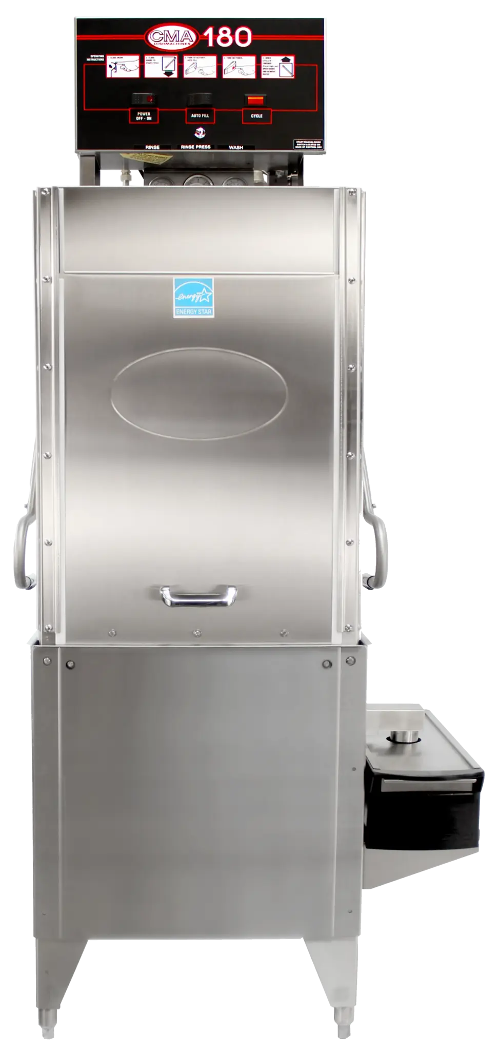 Elevate your cuisine with the CMA Dishmachines 180TallC Dishwasher, Door Type. This pot and pan dishwasher is designed to meet the high demands of a commercial restaurant kitchen. With its corner design and compact dimensions of 25-1/2"W x 25"D x 70"H, it maximizes space efficiency without compromising on performance. The high temperature sanitizing feature ensures that your dishes are thoroughly cleaned and sanitized, meeting the strictest hygiene standards. The split-door design provides a generous 27"H dish clearance, allowing for easy loading and unloading. The built-in chemical resistant 7kW tank heater ensures optimal water temperature for effective cleaning. The automatic soil purging system and external Poly Pro scrap accumulator make maintenance a breeze. With a top mounted control box and interchangeable wash arms, this dishwasher offers versatility and convenience. Made of durable stainless steel construction, it is built to withstand the rigors of a busy restaurant kitchen. Trust the CMA Dishmachines 180TallC Dishwasher, Door Type to deliver exceptional cleaning performance and efficiency for your commercial restaurant.