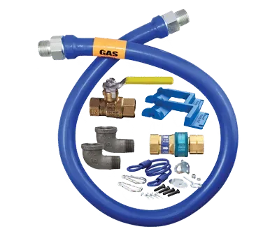 Unleash efficiency in safe appliance positioning with the Dormont Manufacturing, 16100KIT24PS, Gas Connector Hose Kit. Designed specifically for commercial restaurant use, this kit includes a 24" long, 1" inside diameter hose covered with a stainless steel braid and coated with blue antimicrobial PVC. The hose is equipped with a SnapFast QD for easy installation and a full port valve for optimal gas flow control. With two 90-degree elbows and a pair of Safety Set with hardware mounting options, this kit ensures secure and flexible appliance connections. The Dormont Manufacturing Gas Connector Hose Kit is backed by a limited lifetime warranty, providing peace of mind and reliability in a demanding restaurant environment. Trust Dormont Manufacturing for top-quality gas connector solutions that prioritize safety, efficiency, and durability. Upgrade your restaurant's appliance setup with this essential kit.