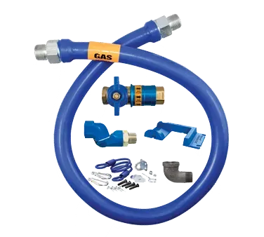 Achieve precision in efficient gas cooking and heating with the Dormont Manufacturing, 16100KITCFS36PS Gas Connector Hose Kit. This kit is designed to meet the demands of commercial restaurant settings, ensuring safe and reliable gas connections. The kit includes a 36" long, 1" inside diameter Dormont Blue Hose, covered with a stainless steel braid and coated with blue antimicrobial PVC. It also features a Safety Quik QDV, a Swivel MAX, and a pair of Safety Set with hardware mounting options. With a limited lifetime warranty, you can trust in the durability and longevity of this gas connector hose kit. Dormont Manufacturing, a trusted vendor in the industry, has packed this kit with precision and attention to detail. Upgrade your restaurant's gas connections with the Dormont Manufacturing, 16100KITCFS36PS Gas Connector Hose Kit and experience enhanced safety and efficiency in your kitchen.