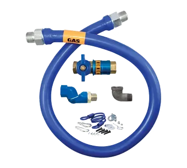Elevate standards with cutting-edge safe appliance positioning using the Dormont Manufacturing Gas Connector Hose Kit. Designed specifically for commercial restaurant use, this kit includes a 48" long, 1" inside diameter hose covered with a stainless steel braid and coated with blue antimicrobial PVC. The hose is equipped with a Safety Quik QDV and a Swivel MAX for easy installation and flexibility. To ensure maximum safety, the kit also includes a coiled restraining cable with hardware. With a minimum flow capacity of 310,000 BTU/hr, this kit provides reliable and efficient gas connection for your appliances. Backed by a limited lifetime warranty, you can trust the quality and durability of this Dormont Manufacturing kit. Upgrade your restaurant's gas connections with this high-quality, restaurant-grade gas connector hose kit.