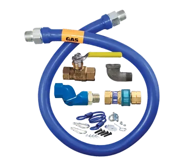 Ignite passion with an essential tool for gas cooking and heating. Introducing the Dormont Manufacturing 16100KITS72 Gas Connector Hose Kit, a must-have for commercial restaurant use. This kit includes a 72" long, 1" inside diameter hose covered with a stainless steel braid and coated with blue antimicrobial PVC. It also comes with a Snap Fast QD, a Swivel MAX, a full port valve, and an elbow for easy installation. The coiled restraining cable with hardware ensures safety and convenience. With a minimum flow capacity of 260,000 BTU/hr, this kit can handle the demands of a busy restaurant kitchen. Plus, it comes with a limited lifetime warranty, giving you peace of mind. Trust Dormont Manufacturing, a reputable vendor in the industry, and equip your restaurant with the reliable and durable 16100KITS72 Gas Connector Hose Kit. Upgrade your kitchen today and experience the difference in performance and safety.