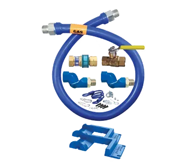 Introducing the Dormont Manufacturing Gas Connector Hose Kit, model number 16125KIT2S48PS. This dream-bringing product is a must-have for commercial restaurants seeking reliable water access and use. With its 1-1/4" inside diameter and 48" length, this kit ensures a seamless connection between your gas equipment and water supply. The stainless steel braid and blue antimicrobial PVC coating provide durability and hygiene, making it perfect for restaurant settings. The kit includes a SnapFast QD for easy installation, two Swivel MAX connectors for flexibility, and a full port valve for optimal control. Safety is a top priority, which is why the kit also includes a pair of Safety Set with hardware mounting options. Backed by a limited lifetime warranty, this Dormont Manufacturing Gas Connector Hose Kit guarantees peace of mind and long-lasting performance. Upgrade your restaurant's water access with this reliable and efficient kit.