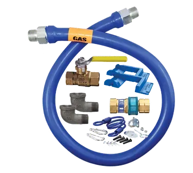 Introducing the Dormont Manufacturing 1650KIT60PS Gas Connector Hose Kit, designed to inspire with unique water access and use. This kit includes a 60" long, 1/2" inside diameter Dormont Blue Hose, covered with a stainless steel braid and coated with blue antimicrobial PVC. The hose is equipped with a SnapFast QD for easy installation and a full port valve for optimal gas flow control. With two 90-degree elbows and a pair of Safety Set with hardware mounting options, this kit offers flexibility and convenience in any commercial restaurant setting. The Dormont Manufacturing Gas Connector Hose Kit is backed by a limited lifetime warranty, ensuring its durability and reliability. Trust Dormont Manufacturing, a reputable vendor in the industry, to provide you with a high-quality gas connector hose kit that meets all your restaurant's needs.