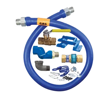 Introducing the Dormont Manufacturing 1650KITS36PS Gas Connector Hose Kit, designed to inspire with unique water access and use. This kit is perfect for commercial restaurant settings, offering a reliable and efficient solution for gas connections. The 1/2" inside diameter and 36" length provide flexibility and convenience, allowing for easy installation and movement. Covered with a stainless steel braid and coated with blue antimicrobial PVC, this hose ensures durability and cleanliness, meeting the highest hygiene standards. The kit includes essential components such as the SnapFast QD, Swivel MAX, full port valve, elbow, and Safety Set with hardware mounting options. With a limited lifetime warranty, you can trust in the quality and longevity of this product. Upgrade your restaurant's gas connection system with the Dormont Manufacturing 1650KITS36PS Gas Connector Hose Kit and experience enhanced safety, efficiency, and peace of mind.