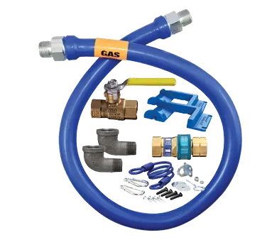 Enhance positioning with innovative gas cooking and heating using the Dormont Manufacturing, 1675KIT24PS Gas Connector Hose Kit. This kit is designed specifically for commercial restaurant use, providing a reliable and safe connection for gas-powered equipment. The kit includes a 24" long hose covered with a stainless steel braid and coated with blue antimicrobial PVC, ensuring durability and cleanliness. With the included SnapFast QD, full port valve, and 90-degree elbows, installation is quick and easy. The SnapN Go feature allows for convenient disconnecting and reconnecting of equipment. Safety is a top priority with the included pair of Safety Set with hardware mounting options. Backed by a limited lifetime warranty, this gas connector hose kit offers peace of mind and long-lasting performance. Trust Dormont Manufacturing for all your gas connection needs in a commercial restaurant setting.