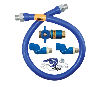 Transform your commercial kitchen with the Dormont Manufacturing Gas Connector Hose Kit. Designed for safe appliance positioning, this kit includes a 72" long, 3/4" inside diameter Dormont Blue Hose covered with a stainless steel braid and coated with blue antimicrobial PVC. The hose has a minimum flow capacity of 124,000 BTU/hr, ensuring efficient gas supply to your restaurant equipment. The kit also includes a Safety Quik QDV for easy and secure connection, two Swivel MAX fittings for flexibility, and a coiled restraining cable with hardware for added safety. With a limited lifetime warranty, you can trust the durability and reliability of this kit. Whether you're setting up a new restaurant or upgrading your existing kitchen, the Dormont Manufacturing Gas Connector Hose Kit is a must-have for ensuring the safety and efficiency of your commercial kitchen appliances.