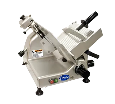Streamline your restaurant cooking operations with the Globe G10 Electric Food Slicer. This manual slicer is designed to make slicing food a breeze, with its 10" diameter knife and extended chute and end weight that can accommodate products up to 10-1/2" in height. The pyramid-shaped end weight teeth and gripping teeth on the underside of the end weight ensure a secure grip on the food, while the top-mounted sharpener keeps the knife sharp for precise slicing every time. The belt-driven, ball bearing chute slide allows for smooth and effortless operation. Safety features include an attached knife ring guard, knife cover interlock, and removable slice deflector. With its anodized aluminum construction and 1/3 HP motor, this food slicer is built to withstand the demands of a commercial restaurant kitchen. Upgrade your slicing capabilities with the Globe G10 Electric Food Slicer.
