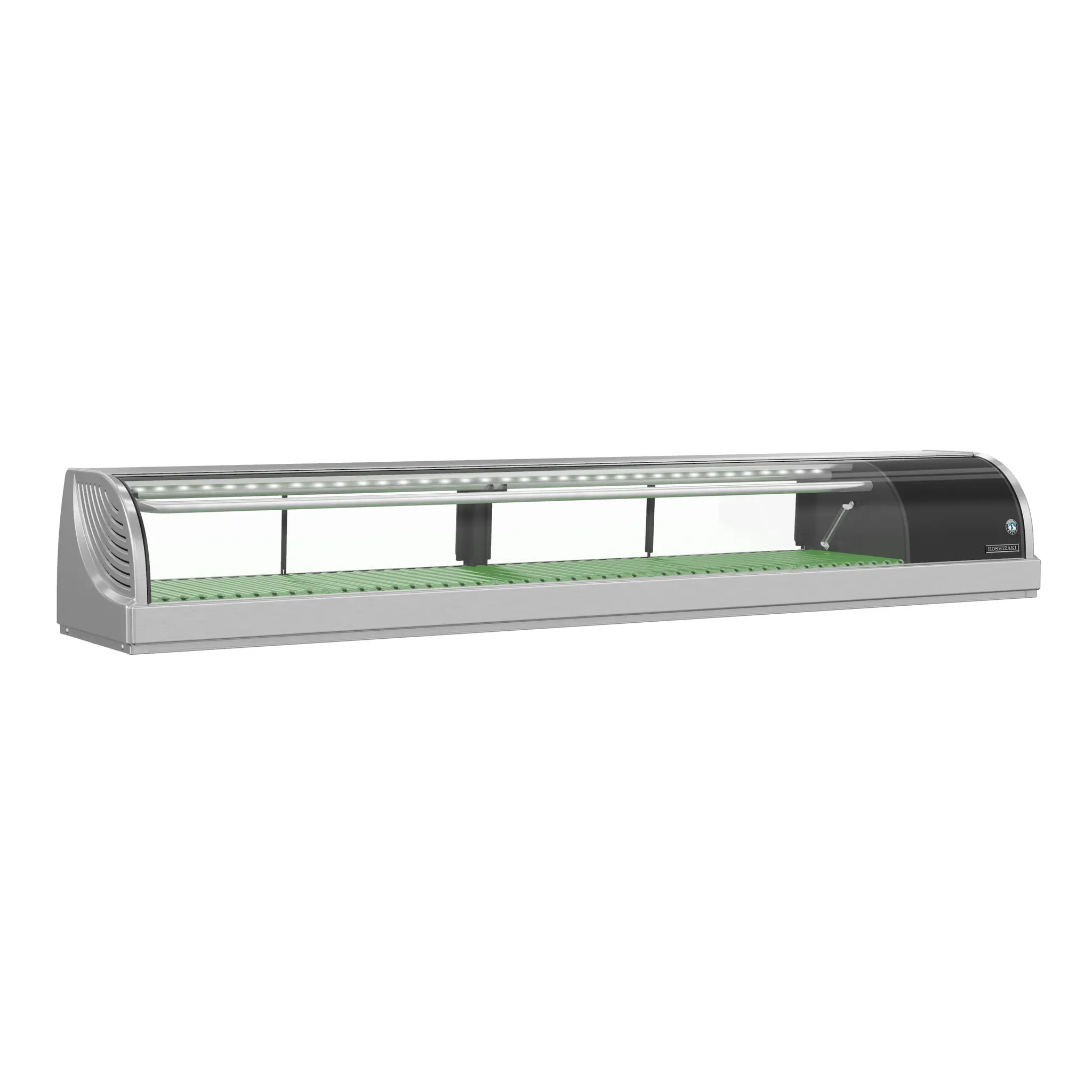 Full length front glass curves down, for an attractive display of items that is easy to clean. The HNC-180BA-R-SLH includes food plates - 5 pieces, with radius groove to fit sushi and other foods. It features a large diameter upper evaporator with tin plating, and a larger front to back interior, 11" depth. The unit is NSF and includes a two years parts warranty on compressor: air-cooled condenser / one year parts & labor warranty on entire machine.