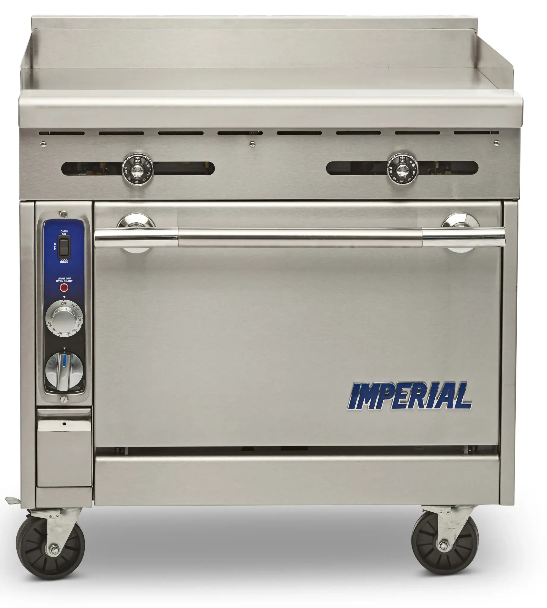 Boost your restaurant's performance with the Imperial, IHR-GT36-C, Range, 36" Heavy Duty, Gas. This Diamond Series Heavy Duty Range is designed to meet the demands of a busy commercial kitchen. With a 36" griddle and a convection oven equipped with three chrome racks, this range offers versatility and efficiency. The thermostatic controls allow for precise temperature regulation, ensuring consistent cooking results. The 4"W grease gutter helps to keep the cooking surface clean and the stainless steel construction of the front, sides, landing ledge, backguard, and kick plate ensures durability and easy cleaning. The adjustable feet and 6" legs provide stability and flexibility in installation. With a 1/4 HP motor and 125,000 BTU, this range delivers powerful performance. Certified by cETlus, ETL, and NSF, the Imperial, IHR-GT36-C, Range, 36" Heavy Duty, Gas is a reliable and high-quality choice for any commercial restaurant.