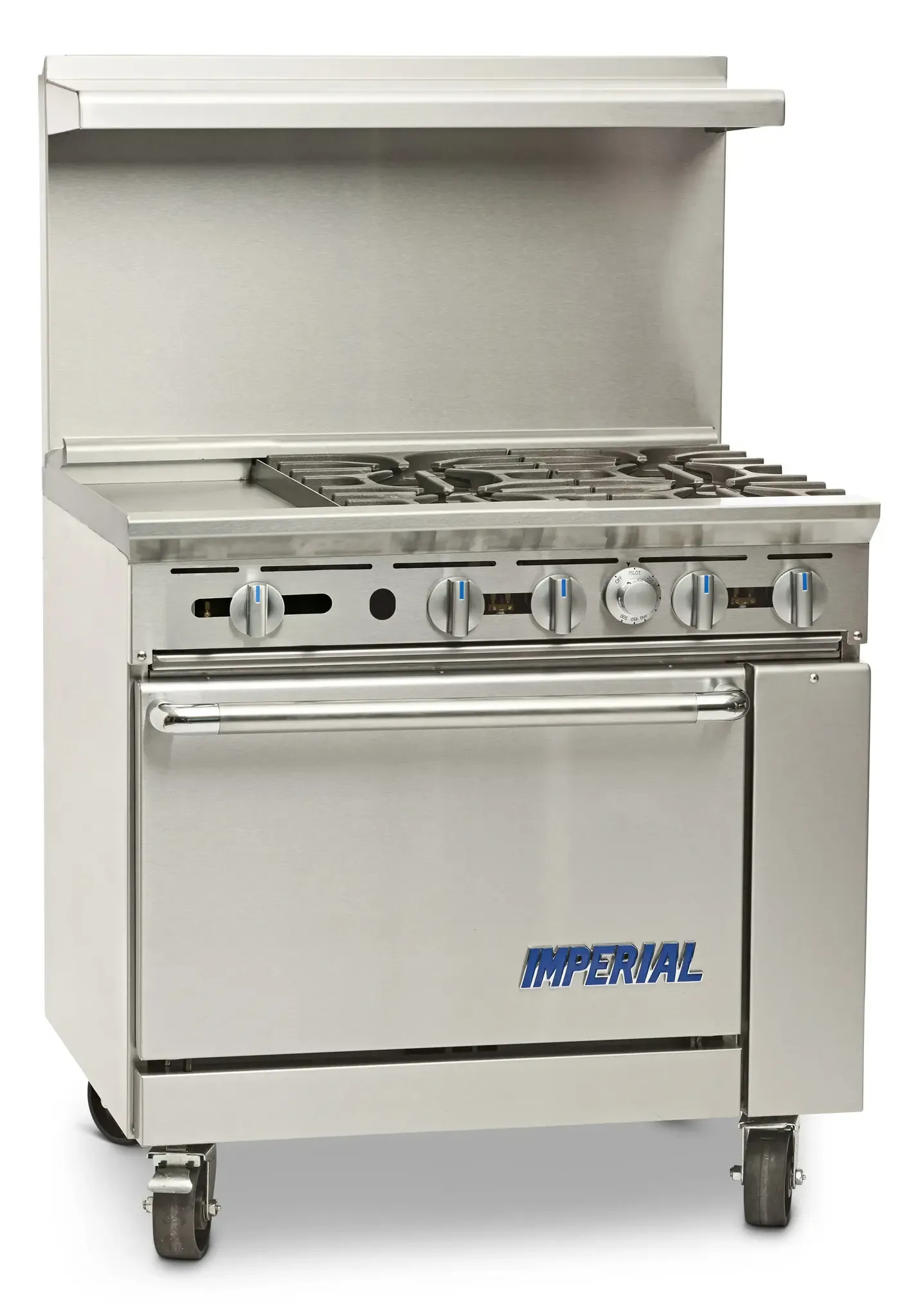 Unleash culinary creativity with the Imperial IR-4-G12 Range, a versatile and powerful addition to any commercial restaurant kitchen. This gas restaurant range features four open burners, allowing for precise temperature control and efficient cooking. The 12" griddle provides a flat cooking surface perfect for preparing pancakes, eggs, and other breakfast favorites. The standard oven is equipped with a chrome rack and a removable crumb tray for easy cleaning. With a stainless steel front, sides, backguard, landing ledge, and kick plate, this range is not only durable but also adds a sleek and professional look to your kitchen. The adjustable feet and 6" legs ensure stability and flexibility in any kitchen layout. With a whopping 183,000 BTU, this range delivers exceptional cooking power. NSF, CE, CSA Flame, and CSA Star certified, the Imperial IR-4-G12 Range is a reliable and efficient choice for any commercial restaurant.