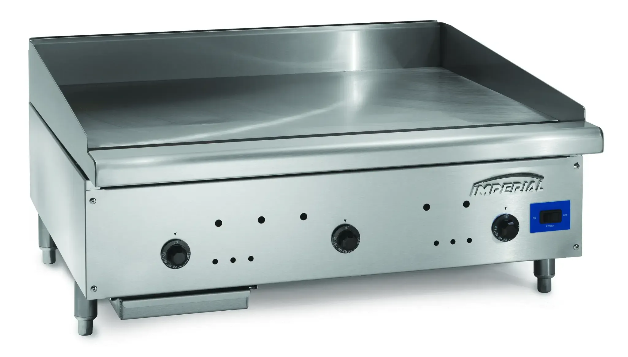 Fuel your restaurant's success with the Imperial ISAE-48 Gas Countertop Griddle. This high-quality griddle is designed to meet the demands of a busy commercial kitchen. With a 48" wide by 24" deep cooking surface, you'll have plenty of space to cook multiple items at once. The 1" thick smooth steel plate ensures even heat distribution for consistent cooking results. The snap action thermostat allows for precise temperature control, while the 4" wide grease gutter and removable grease can make cleaning up a breeze. Made with stainless steel front, sides, ledge, and splash guards, this griddle is not only durable but also easy to clean. The 4" legs provide stability, and the 6" cord and plug make installation simple. With 96,000 BTU of power, this griddle is ready to handle any cooking task. Trust Imperial for all your commercial kitchen needs.