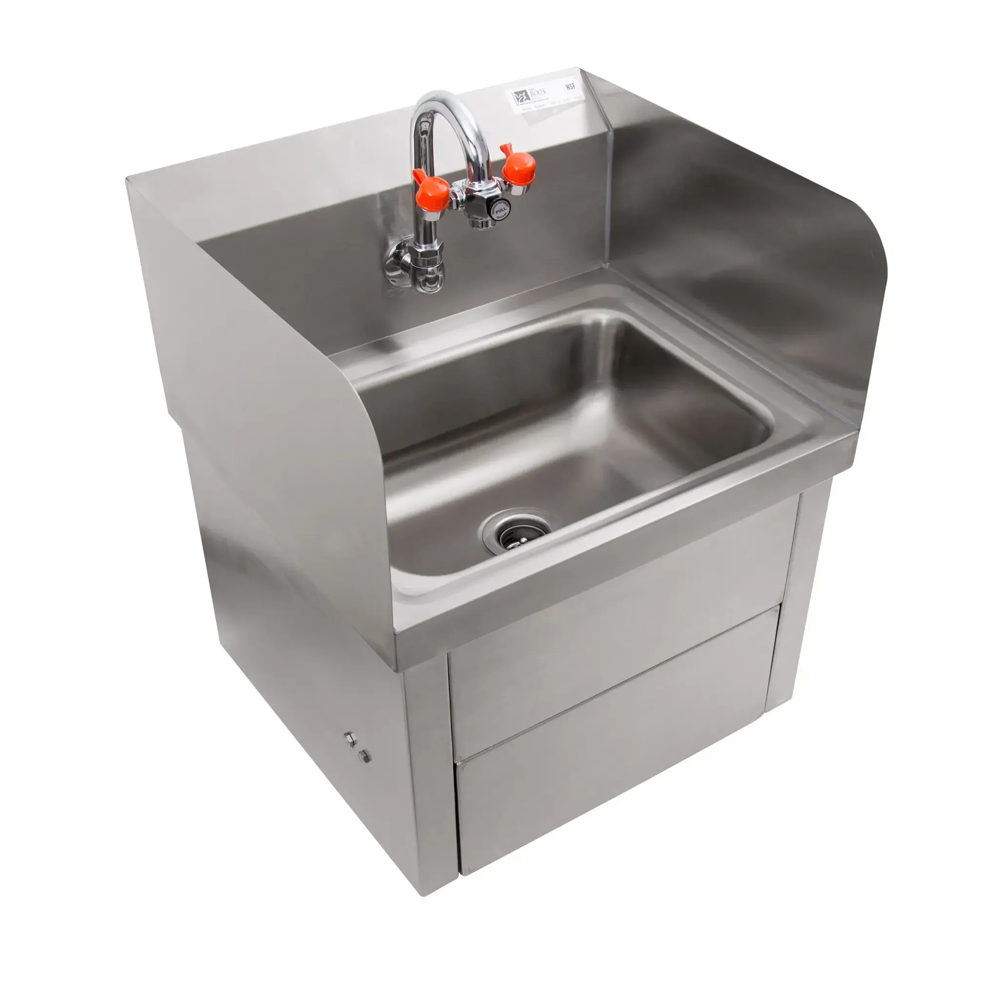 Streamline workflow with innovative resources using the John Boos PBHS-W-1410-KV1APS-EW Hand Sink with Eye Wash. This wall-mounted hand sink is designed to enhance efficiency in commercial restaurant settings. With its 14-inch width and 10-inch front-to-back depth, it provides ample space for handwashing. The 5-inch deep bowl ensures thorough cleaning, while the knee-activated hinged front apron allows for hands-free operation, promoting hygiene and convenience. The 3-12 gooseneck faucet with an eye wash attachment adds an extra layer of safety, making it ideal for busy kitchens. Made of stainless steel, this hand sink is durable and easy to clean, meeting NSF standards for food safety. The included mounting bracket ensures easy installation. Upgrade your restaurant's sanitation practices with the John Boos PBHS-W-1410-KV1APS-EW Hand Sink with Eye Wash.