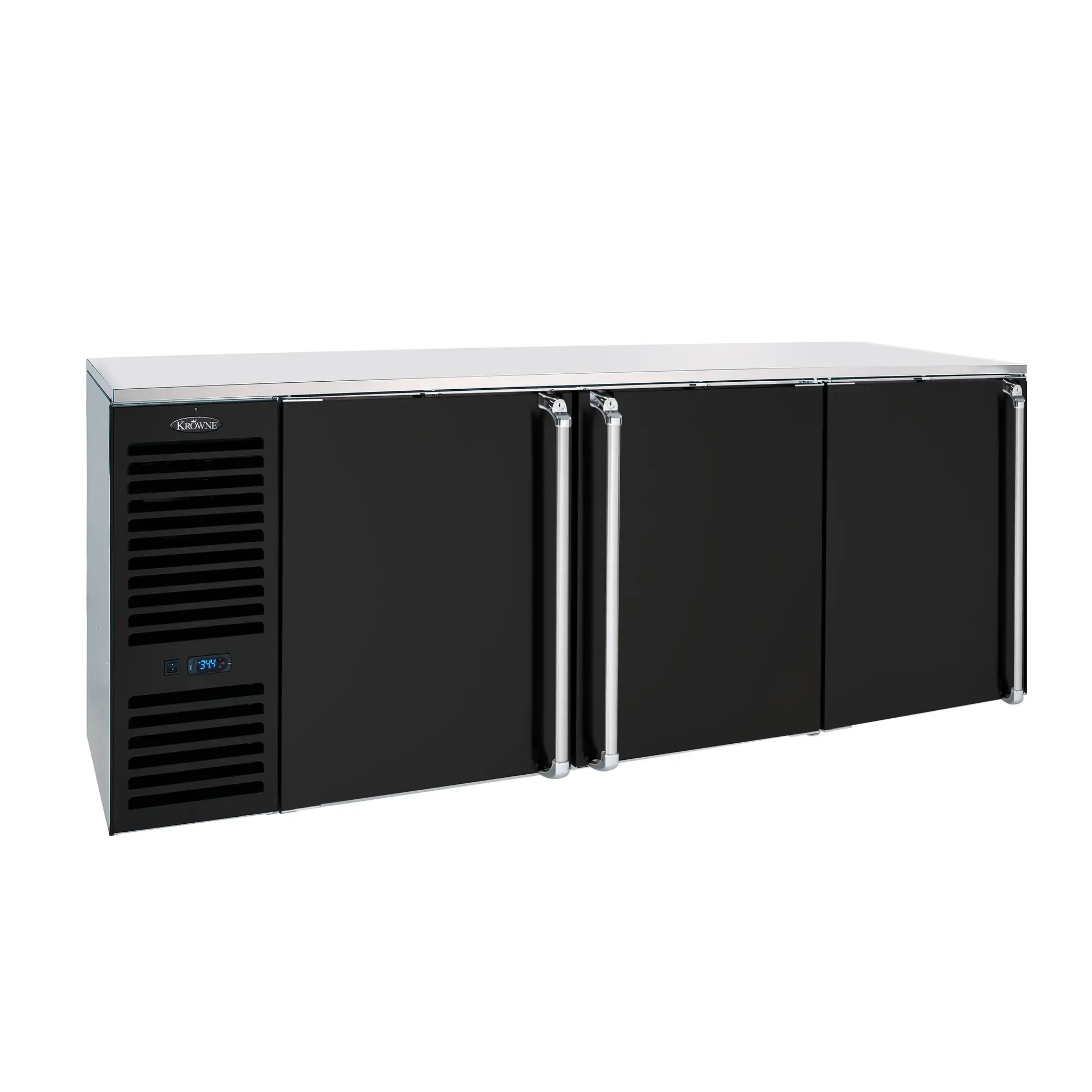 Elevate your cuisine with the Krowne Metal BS84L-BNS-RRR Back Bar Refrigeration. This self-contained three-door back bar cooler is a must-have for any commercial restaurant. With its spacious 84" width and 24" depth, it provides ample refrigerated storage space for your beverages and ingredients. The side-mounted self-contained refrigeration system ensures a temperature range of 30F to 40F, keeping your items perfectly chilled. The three hinged doors come with locks for added security, and each door is equipped with two adjustable shelves and a floor rack, allowing for customizable storage options. The digital thermostat and LED interior lights make it easy to monitor and access your items. Made with a stainless steel interior, this back bar cooler is not only durable but also easy to clean. With its ETL-Sanitation and ETLus certifications, you can trust in its quality and reliability. Upgrade your restaurant's refrigeration system with the Krowne Metal BS84L-BNS-RRR Back Bar Refrigeration.