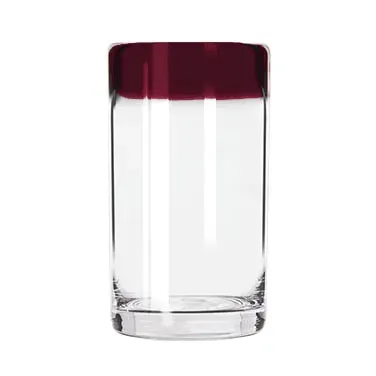 Stay at the forefront of elegance with Libbey Glass, 92303R, Glass, Cooler. This hand-blown, 16 oz. cooler glass is designed to elevate your restaurant's beverage service. With its vibrant red rim and sleek Aruba design, this glass adds a touch of sophistication to any table setting. The anneal treated glass ensures durability, making it dishwasher and microwave safe for easy cleaning and reheating. Its dimensions of H 5-5/8" T 3-1/4" B 3" D 3-1/4" make it the perfect size for serving refreshing drinks to your customers. Whether you're serving cocktails, iced teas, or soft drinks, this Libbey Glass cooler is a must-have for any commercial restaurant looking to impress their guests with style and functionality.