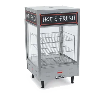 Introducing the Nemco 6454 Display Case, Hot Food, Countertop - an innovative solution for culinary success in commercial restaurants. Crafted with stainless steel construction and a tempered glass case, this heated merchandiser is designed to showcase your delicious hot food items while keeping them at the perfect temperature. With three 15" square shelves and an illuminated interior, your dishes will be beautifully displayed and easily accessible to customers. The thermostat control allows you to adjust the temperature up to 200F, ensuring that your food stays fresh and appetizing. The water reservoir helps maintain humidity levels, preventing your dishes from drying out. Perfect for cafes, delis, and buffets, this NSF-certified display case is a must-have for any foodservice establishment. Trust Nemco, a leading vendor in the industry, to provide you with reliable and high-quality equipment that enhances your restaurant's efficiency and profitability.