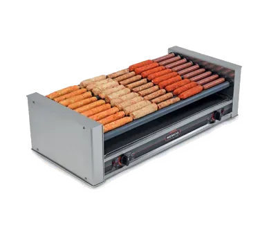 Introducing the Nemco 8036SX-SLT-220 Hot Dog Grill, engineered for culinary mastery with commercial restaurant use in mind. This Roll-A-Grill hot dog grill is a game-changer for any food establishment. With 10 GripsIt coated rollers featuring a 7-degree slant, it can handle up to 36 hot dogs at once, serving a whopping 720 hot dogs per hour. The aluminum and stainless steel construction ensures durability and easy cleaning, while the removable grease pan simplifies maintenance. Equipped with two 7-setting heat control switches and a powerful motor, this grill allows precise temperature control for perfectly cooked hot dogs every time. With 1500 watts of power and NEMA 6-15P plug, it's ready to tackle high-demand environments.